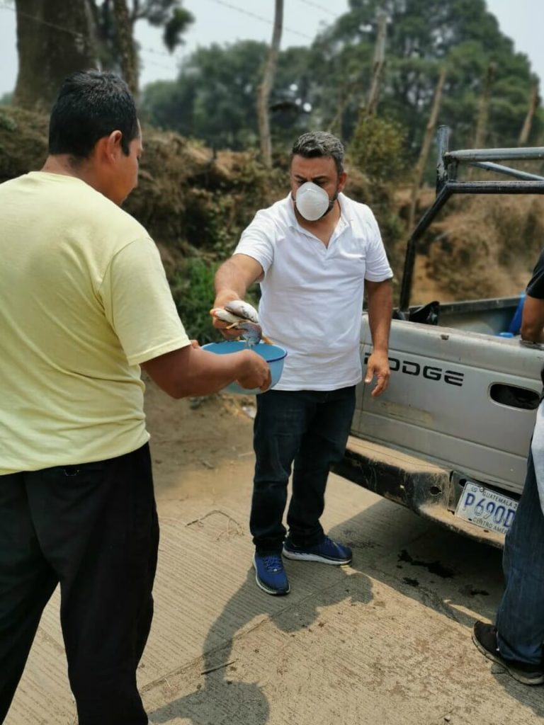 Sergio Alvarez en compañía de su familia y vecinos del mismo municipio realizaron la compra de 1,000 libras de pescado que fueron repartidos a 500 familias vulnerables que habitan en el sector de Santa Elena Barillas.