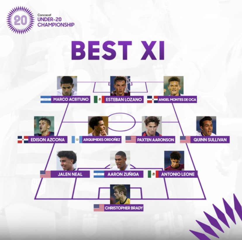 Junto a Arquímides el equipo ideal del Campeonato Sub-20 de Concacaf está conformado por: Christopher Brady (Estados Unidos), Jalen Neal (Estados Unidos), Aaron Zúñida (Honduras), Antonio Leone (México), Edison Azcona (República Dominicana), Paxten Aaronson (Estados Unidos), Quinn Sullivan (Estados Unidos), Marco Tulio Aceituno (Honduras), Esteban Lozano (México) y Angel Montes De Oca (República Dominicana).