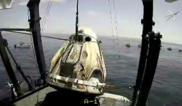 Los dos astronautas pasaron una hora flotando dentro de la cápsula hasta que los recogió el equipo de SpaceX y de la NASA desde un helicóptero.