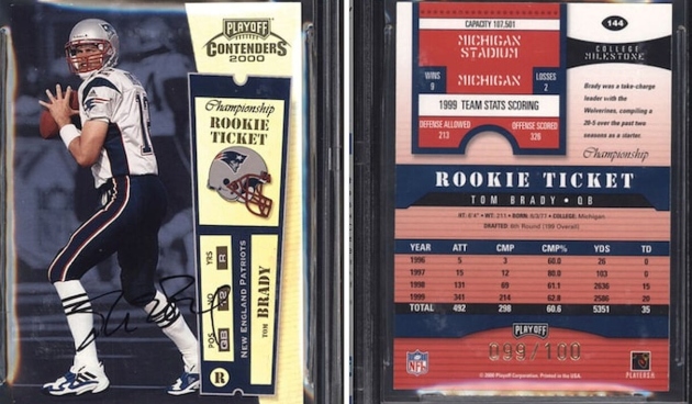 En ese cromo del año 2000, Brady deja su firma. Representado por el uniforme blanco de visitante y con las estadísticas de su etapa universitaria en Michigan en el dorso del cromo. Sería el cromo más valioso de una industria que sigue creciendo y, por supuesto, convertido en un coleccionable de valor indescriptible.