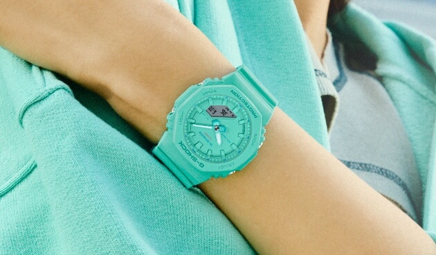 Haz una declaración de estilo con el GMA-P2100-2A en color turquesa. Combina este vibrante reloj con prendas en tonos neutros para dejar que el color resalte por sí solo. Un vestido blanco, unos shorts beige o una camiseta gris serán el lienzo perfecto para destacar la belleza del turquesa y añadir un toque de frescura a tu look. El azul turquesa de este modelo es ideal para crear outfits frescos y veraniegos. Combínalo con prendas en tonos neutros para un estilo casual-chic, o atrévete con estampados florales para un estilo más bohemio y divertido.