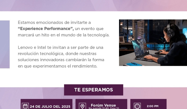 Diseñado para profesionales, entusiastas de la tecnología y público en general, Lenovo e Intel presentan Lenovo XP 2025: Experience Performance with AI, un evento gratuito que marcará un antes y un después en la forma en que se experimenta la tecnología. La actividad se llevará a cabo el próximo 24 de julio a las 2:00 p.m. en Forum Venue, zona 10. Los interesados en asistir únicamente deben registrarse previamente en el código QR que aparece en la invitación adjunta.