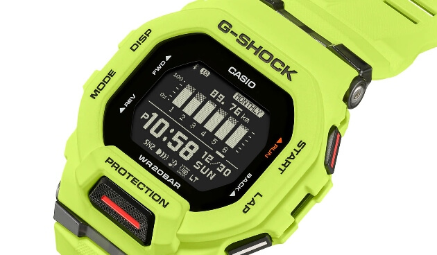 Este reloj forma parte de la serie G-SQUAD, ideales para los estilos de vida más dinámicos y llenos de energía. Las funciones de BlueTooth del GBD-200 ofrecen al usuario varias funciones como acelerómetro, análisis de recuperación post entrenamiento, calorías quemadas, entre otras. Además, es uno de los modelos de la serie con brillante color fosforescente en el bisel, ideal para aquel deportista que adore los colores neón.