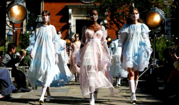 Desfilando bajo el sol del otoño boreal londinense, las modelos, con velos transparentes, también lucieron vestidos con capas en tonos pasteles rosado, azul y morado oscuro, con estampados y encajes.