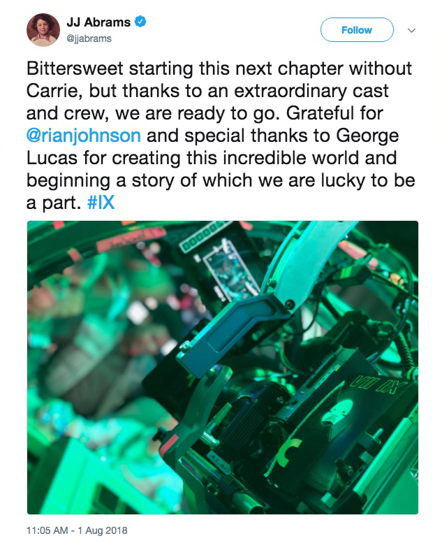 “Agridulce comenzando este próximo capítulo sin Carrie, pero gracias a un elenco y equipo extraordinarios, estamos listos para iniciar. Agradecido por @rianjohnson y un agradecimiento especial a George Lucas por crear este increíble mundo y comenzar una historia de la cual somos afortunados de ser parte”, indicó Abrams en su cuenta de Twitter esta semana.