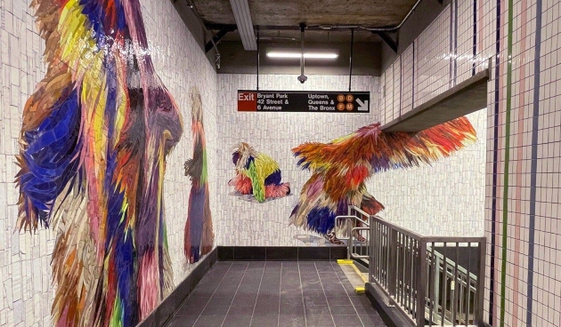 Cave crea, así, una atmósfera de familiaridad mientras reorganiza los objetos en representaciones interpretativas de la cultura social y material que ahora decoran más de 100 metros que abarcan el metro que conecta a Times Square con el Bryant Park en Nueva York.