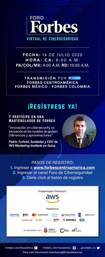 El Foro de Ciberseguridad 2020, se llevará a cabo el martes 14 de julio, a las 8:00am Guatemala (8:00 am Centroamérica. Panamá, Colombia y México a las 9:00am y República Dominicana a las 10:00am).