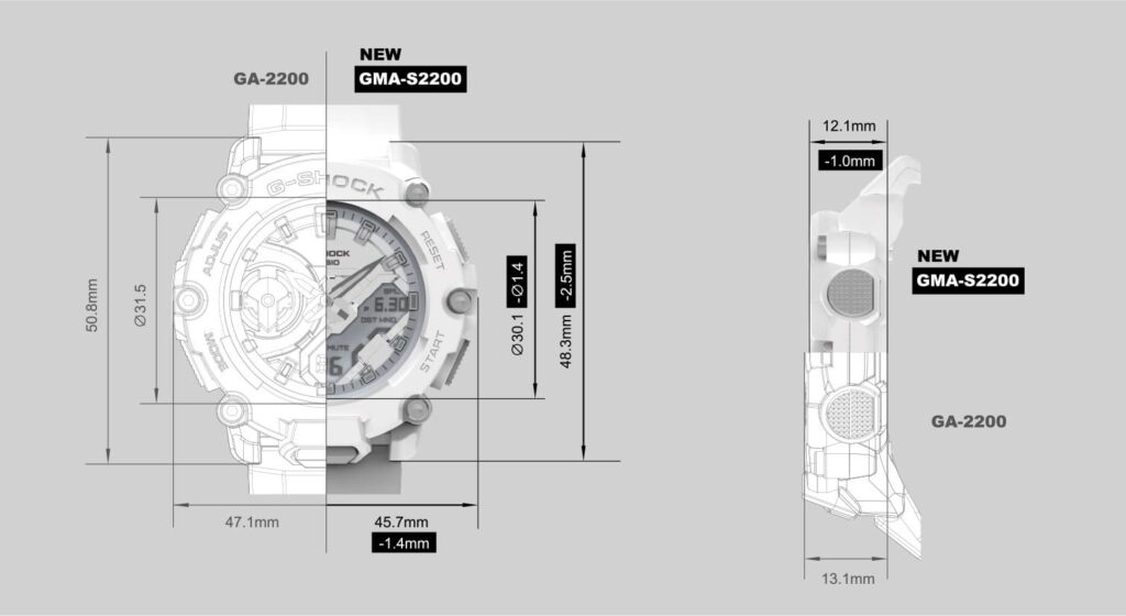 A partir de este mes, podrás encontrar la nueva variante de la familia GA-2200 que han estado desarrollando los ingenieros de CASIO para la gama más pequeña de G-SHOCK. Se trata del GMA-S2200 cuyo diseño es más compacto y estrecho que la variante masculina. Tanto es así que son 2,5 mm menos de alto, 1,4 mm más delgados en las asas, y 1 mm de menos grosor.