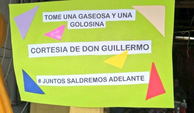 Con un cartel colorido elaborado por el con el mensaje “Toma una gaseosa y una golosina, cortesía de Don Guillermo #JuntosSaldremosAdelante”. fue como entregó parte de su producto