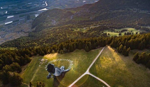 Un artista francés conocido por sus enormes trabajos de graffiti sobre el césped que se ven desde el aire, presentó su última obra el domingo en los Alpes suizos.