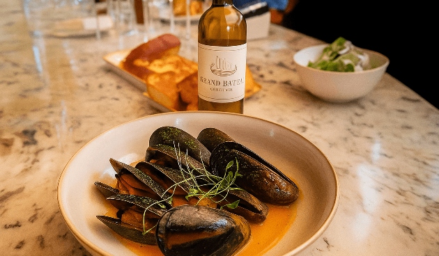 - El Grand Bateau Bordeaux Blanc destaca por sus aromas frescos y afrutados, con notas cítricas y un sutil toque de vainilla aportado por su crianza en roble francés. En boca es vibrante y equilibrado, ideal para acompañar mariscos, como el Moules Frites La Maison, que realza su carácter aromático y vivaz.