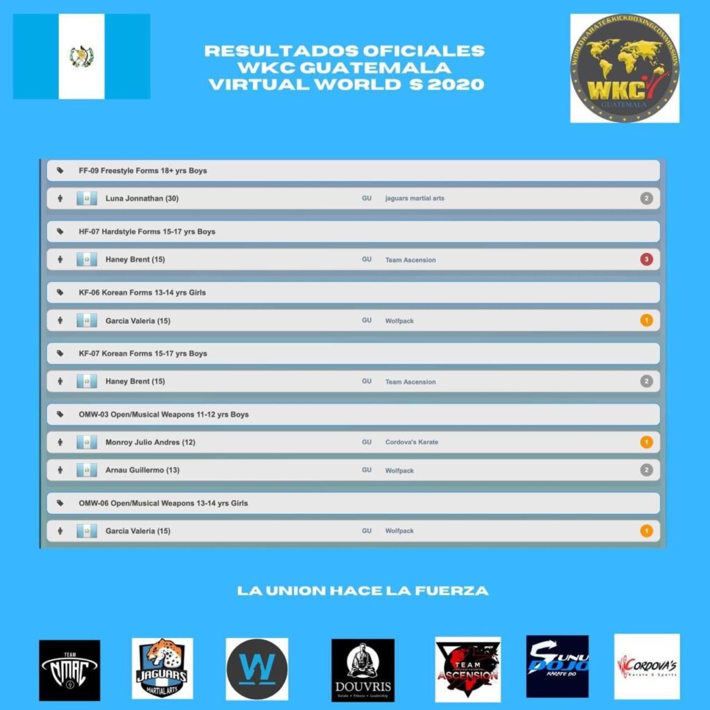 “Gracias, Gracias , Gracias por formar parte de este grupo que representó a WKC Guatemala en este Mundial Vitual. La realidad es que siempre WKC GUATEMALA ha demostrado que somos más unidos, que sumamos más y trabajamos día a día con padres de familia, escuelas, alumnos, todos somos parte de la misma estructura una nutre a la otra”. comentó la página oficial de Facebook de WKC Guatemala