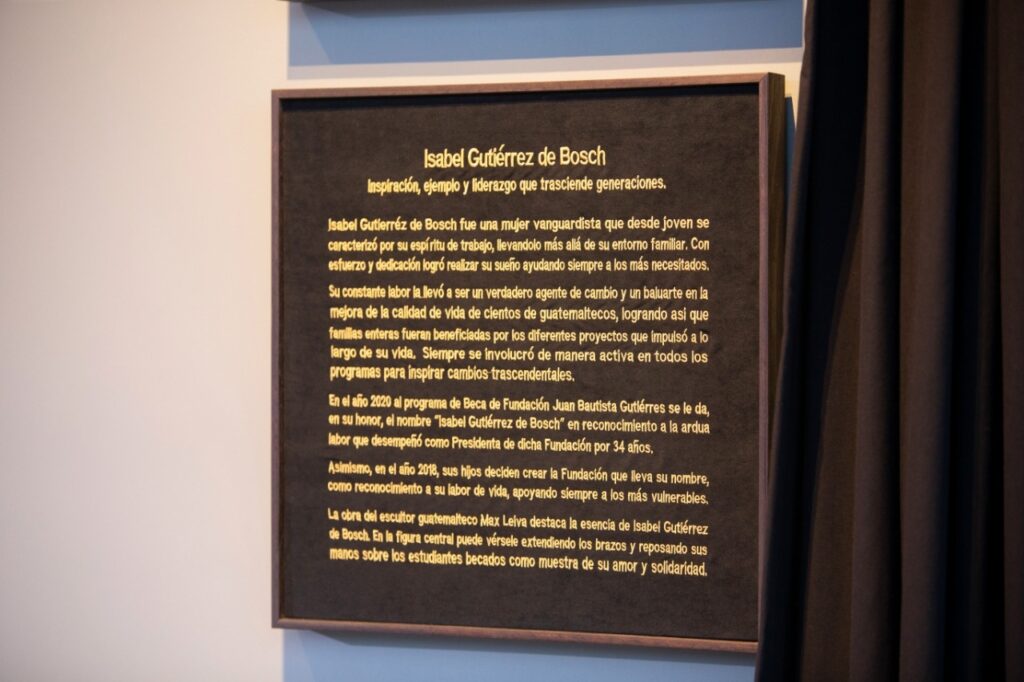 “Inaugurar la Plaza Isabel Gutiérrez de Bosch, como familia nos llena de muchísimo orgullo, agradecimiento y emoción, ya que fue ella, quien con mucha ilusión y compromiso impulsó la formación de jóvenes talentosos en la Universidad del Valle. Agradecemos a la Universidad por este homenaje y por creer, como lo hacía Isabel, en que la educación cambia al mundo. La Plaza Isabel Gutiérrez de Bosch representa el deseo de ver una Guatemala líder en innovación, emprendimiento y formación de talento competitivo con altos valores y compromiso. Esperamos que la semilla que sembró sea ahora una fuente de inspiración para seguir transformado la educación y el país.”, comentó Felipe Bosch, representante de la familia durante el acto de homenaje.
