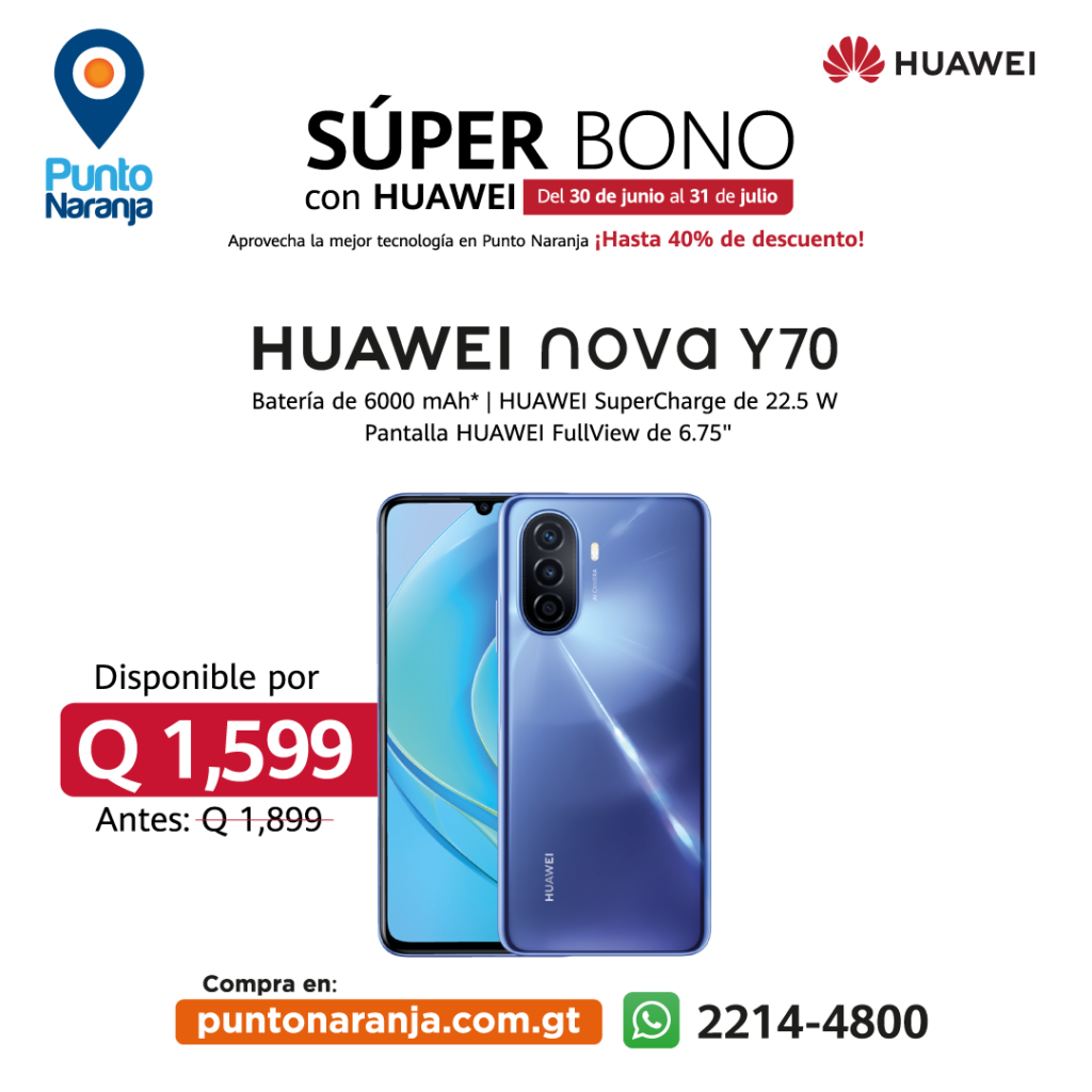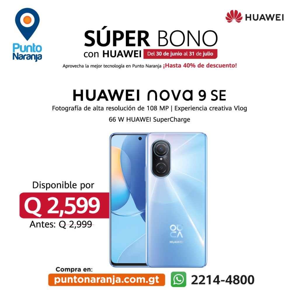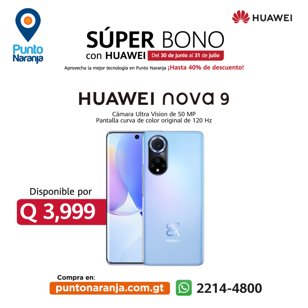 Aprovecha las promociones de Super Bono y adquiere todos estos dispositivos Huawei y muchos más en Punto Naranja, la distribuidora con más de 70 puntos de tecnología y envío gratis a todo el país en compras realizadas en www.puntonaranja.com.gt Hasta el 31 de julio podrás adquirir la nueva HUAWEI Band 7 a solo Q449.00, el HUAWEI nova 9 SE por Q2,599.00, el reciente HUAWEI nova Y70 en Q1,599.00 y el HUAWEI nova 9 por tan solo Q3,999.00.