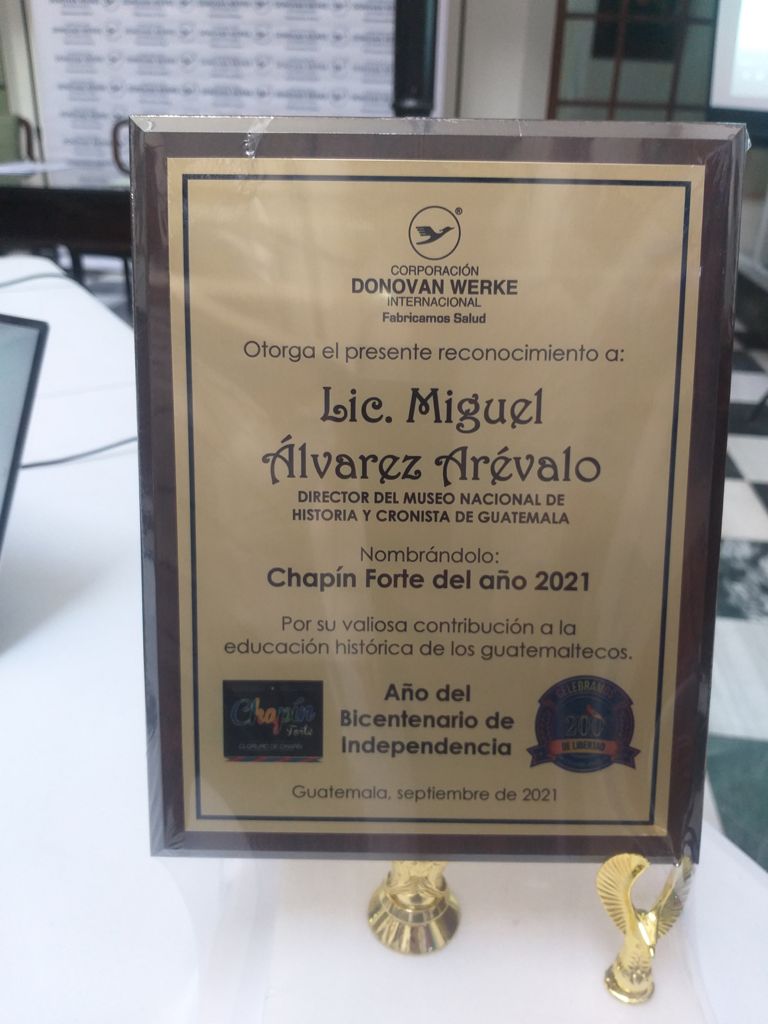 Donovan Werke Internacional, durante el mes patrio otorga el galardón Chapín Forte, a un guatemalteco que se distinga por su trascendencia, ética y alta estima en la ciudadanía debido a sus aportes a nivel social. Este año, en el que se celebra el bicentenario de la independencia, como un respiro de esperanza y vida para los guatemaltecos, no podía quedar sin ser reconocida la labor, del Licenciado Miguel Álvarez Arévalo, el Cronista de la Ciudad, un título honorífico otorgado por el Consejo Municipal de la Ciudad de Guatemala, por su apreciado legado y apoyo para que el origen, tradiciones e historia de nuestro país perduren y trasciendan.