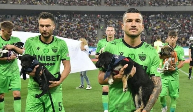 Los jugadores visitantes saltaron al terreno de juego con varios peluditos en brazos de la perrera de la capital, Branesti. La organización, además, le puso un pañuelo a cada perro con su nombre para facilitar así que los aficionados pudieran identificar con mayor facilidad qué perro preferían adoptar.