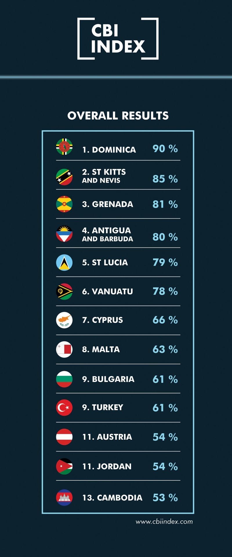 De todas las 13 jurisdicciones mundiales CBI, Dominica encabeza la industria, consiguiendo notas perfectas en cinco de los siete pilares en los que se evalúa el programa. Cuatro naciones del Caribe la siguen de cerca, con CBI siendo pionera con St Kitts y Nevis como destacado contendiente. Los programas que se han evaluado en el CBI Index de este año incluyen los ofrecidos por Antigua y Barbuda, Austria, Bulgaria, Camboya, Chipre, Dominica, Granada, Jordania, Malta, St Kitts y Nevis, St Lucia, Turquía y Vanuatu.