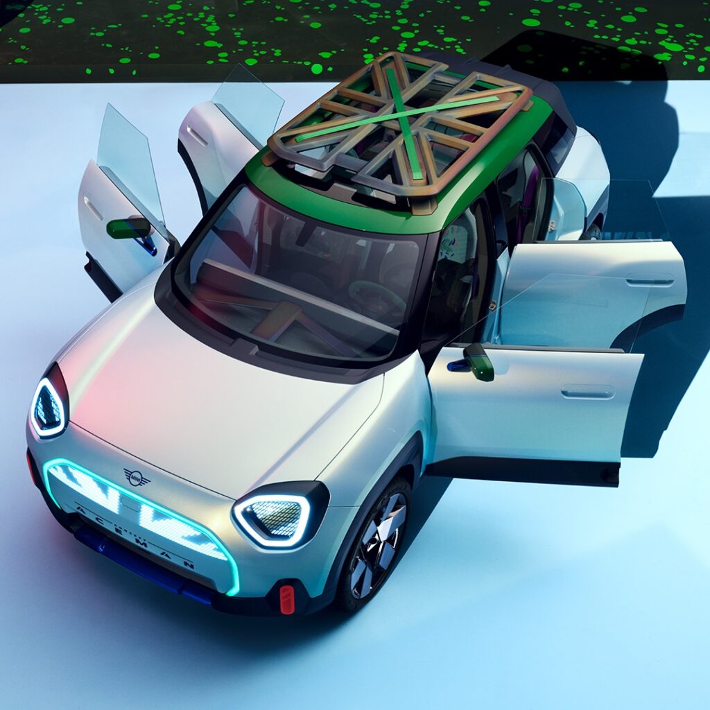 El Concept Aceman mide 4,05 metros de largo, 1,99 de ancho y 1,59 metros de alto. Es decir, tiene las dimensiones de un utilitario, pero con mayor altura gracias a una baca con el diseño de la Union Jack que incorpora correas de sujeción. Su diseño, que anticipa lo que veremos en los Mini de próxima generación, es mucho más rectilíneo de lo que hemos visto hasta ahora en los 60 años de historia de Mini, hasta el punto de que hasta los pasos de rueda (que albergan llantas de 20″) adoptan formas trapezoidales.