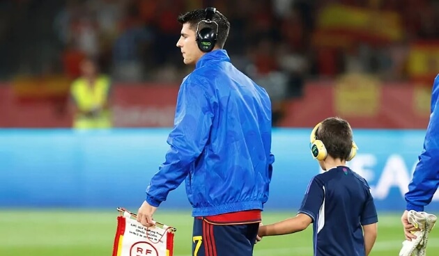 Ambos futbolistas salieron al campo con unos cascos puestos, igual que los niños que llevaban de la mano. El motivo es que los jóvenes tienen autismo y son muy sensibles a ruidos demasiado fuertes, así que los jugadores españoles decidieron saltar al terreno de juego en las mismas condiciones que ellos, con unos auriculares de cancelación de ruido.