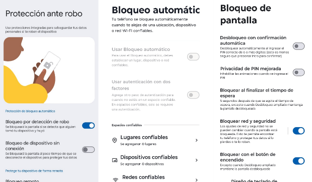 Theft Detection Lock, Remote Lock, y Offline Device Lock están disponibles en la mayoría de los teléfonos Android 10+. Los ajustes Failed Authentication Lock, Factory Reset Protection, and Protect Sensitive están disponibles en los dispositivos con Android 15.