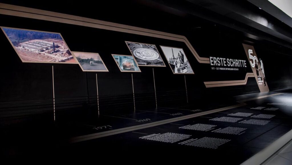 Para homenajear a los diferentes departamentos de Weissach, la exposición se divide en las siguientes áreas: Primeras Fases, Plataformas de Pruebas/Túnel de Viento, Porsche Engineering, Diseño, Automovilismo Deportivo y Centro. La parte de Primeras Etapas abarca la historia del Centro de Desarrollo y la ceremonia de colocación de la primera piedra, en 1961. Después, los visitantes pasan por modelos curiosos; entre ellos, un autobús de la brigada de bomberos de Weissach de 1972.