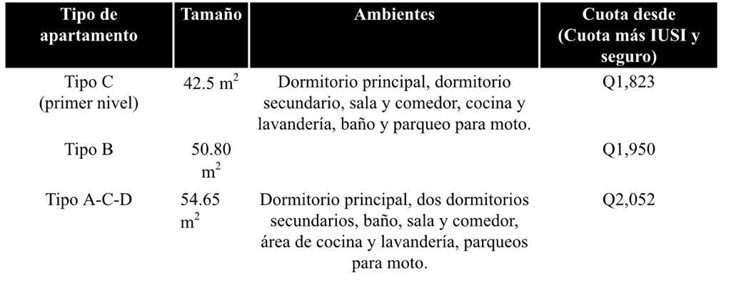 Se ofrece la opción de parqueos de carro (solamente en alquiler) para los propietarios. El proyecto contará con tres tipos de apartamentos: