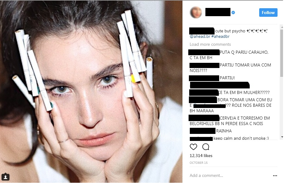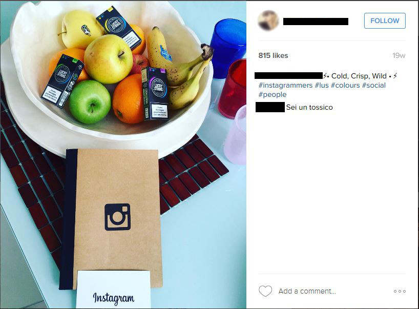 • Las tabacaleras buscan jóvenes que tengan un gran número de seguidores en línea y les pagan para que pongan fotos de Marlboro, Lucky Strike y otras marcas de cigarrillos. A los influenciadores en los medios sociales se les indica qué marcas de cigarrillos deben promover, cuándo deben poner fotos para que tengan un máximo de exposición y cómo tomar “fotos naturales” que no parezcan anuncios planeados. En Italia, a los influenciadores pagados para promover los cigarrillos Lucky Strike se les instruyó que los avisos sobre la salud en los paquetes de cigarrillos no fueran visibles en las fotos colocadas en línea.