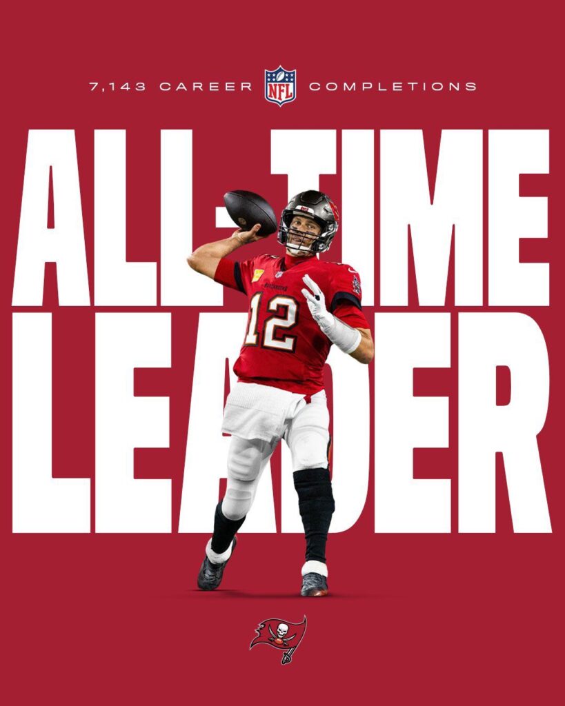El quarterback de los Tampa Bay Buccaneers entró al partido contra Bills con 7,125 pases completos a su nombre, a 17 envíos conectados de Drew Brees. Brady tardó menos de una mitad de juego para superar a Brees en el rubor, con el pase N° 18 de encuentro llegando en una segunda oportunidad y 10 en la marca de 0:56 del segundo periodo, envío de 5 yardas para el corredor Leonard Fournette.