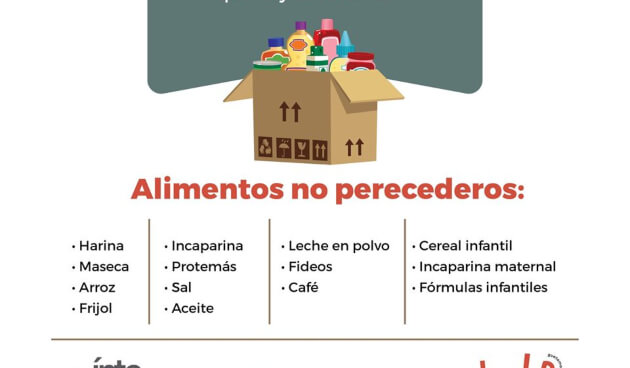 Los productos que puedes donar son: fríjol, arroz, atol nutritivo, pasta, texturizado de soya, harina de maíz, aceite, sal, azúcar, jabón de manos, cloro, Maseca, Incaparina, protemás, fideos, café, cereal infantil o cualquier otro producto no perecedero.