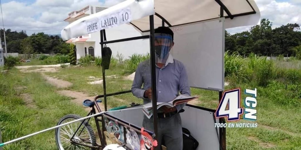 El profesor visita al rededor de 8 alumnos al día con sus libros, marcadores, mascarilla y careta, demostrando que en todo momento se debe seguir adelante con una buena actitud.