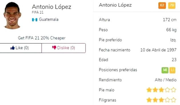 Eso sí, la bandera de Guatemala podrá verse en el videojuego gracias a la presencia del mexicano-guatemalteco Antonio de Jesús López, quien juega para el prestigioso Club América, de México. ‘Chucho’, quien apenas ha disputado dos partidos con la Bicolor (ante México 0-3 y Nicaragua 0-0), es el único seleccionado nacional.