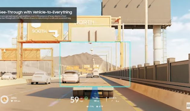 El video a continuación presenta a los espectadores el stand de Samsung en CES 2022, donde la compañía muestra un escenario en el que se presenta información en tiempo real al conductor de un vehículo sobre las condiciones de la carretera y otros factores.