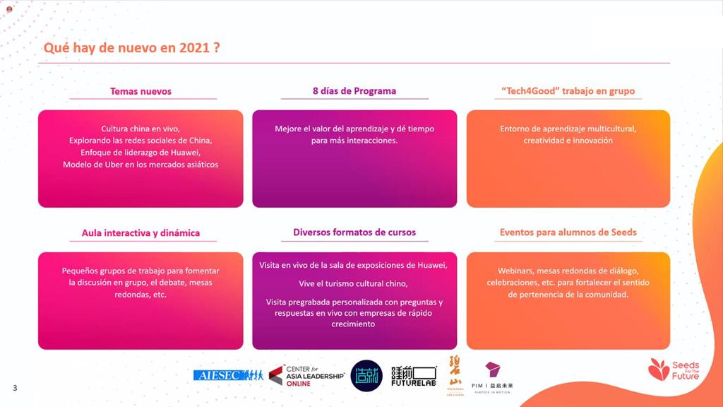 La semana de capacitación para los becados seleccionados se realizará del 22 al 29 de noviembre, junto a México y República Dominicana, de forma virtual por medio de la plataforma de iLearningX, un ecosistema de aprendizaje con 47 cursos pregrabados, cursos en vivo y el apoyo de expertos las 24 horas. Además, este año se tienen nuevos temas dedicados a la parte cultural, se extiende de cinco a ocho días de estudio, se llevarán a cabo sesiones de grupo con debates, discusiones, y más para dialogar entre culturas.