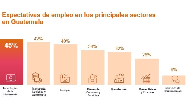 Guatemala ocupa el séptimo lugar a nivel global por sus expectativas de empleo, 5 puntos porcentuales por encima del promedio. “Guatemala se consolida como un motor emergente de empleo en la región, con sectores estratégicos que están impulsando la demanda de talento”, afirmó Ricardo Gálvez, Country Manager de ManpowerGroup en Guatemala.