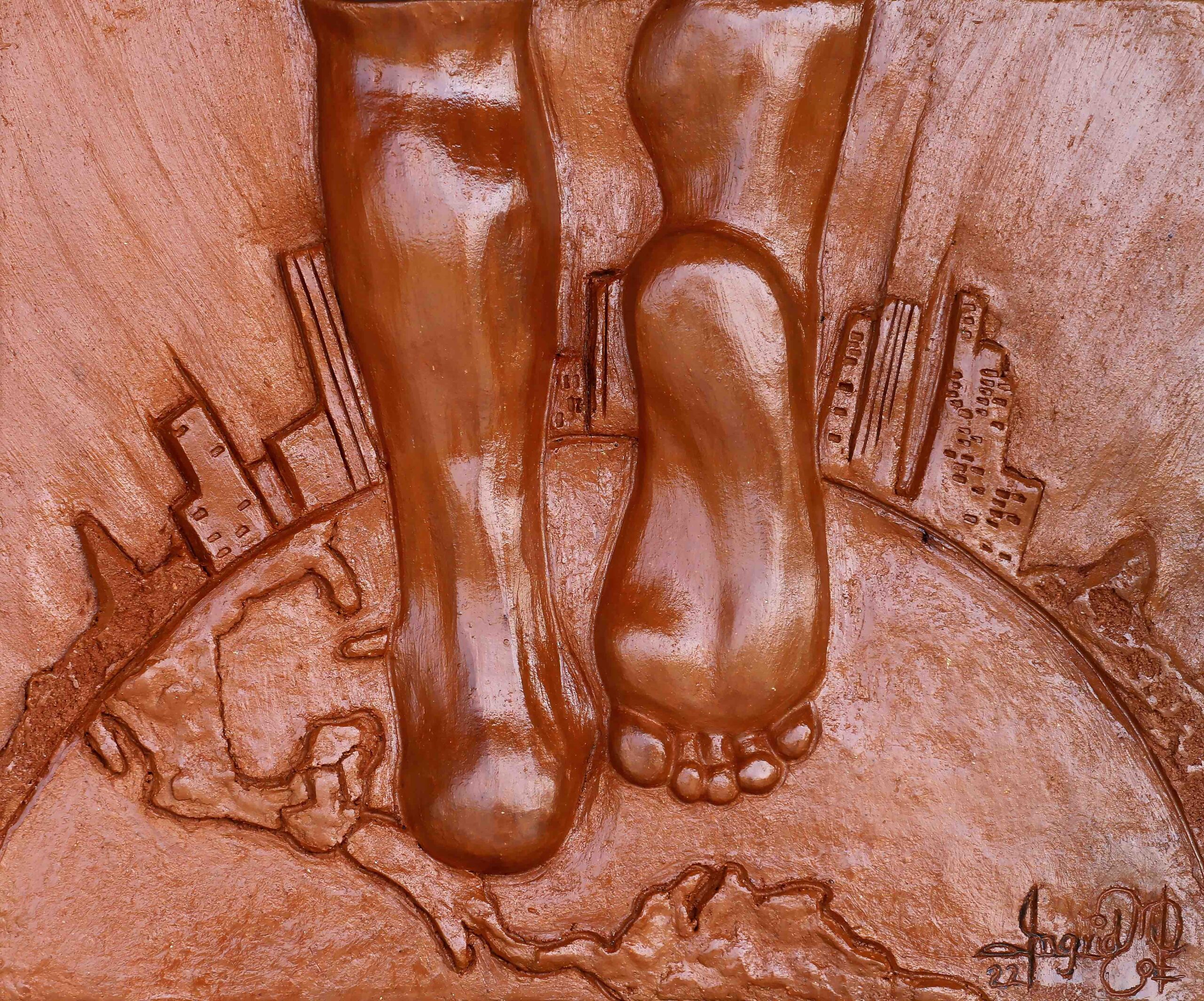 La obra es un conjunto escultórico con un total de 22 piezas divididas en dos grupos de 11 módulos cada uno y dispuestos unos de otros de forma que representan en planta un círculo abierto cuyo símbolo es el abrazo universal. Cada módulo representa la evolución del ser humano y esta evolución se representa por medio de un área trabajada en espacio negativo, transparente (la figura abstraída de un ser humano con el símbolo de llevar sobre sus espaldas “algo” ese algo con el que se parte en el viaje) y que representa el alma y el espíritu humano.