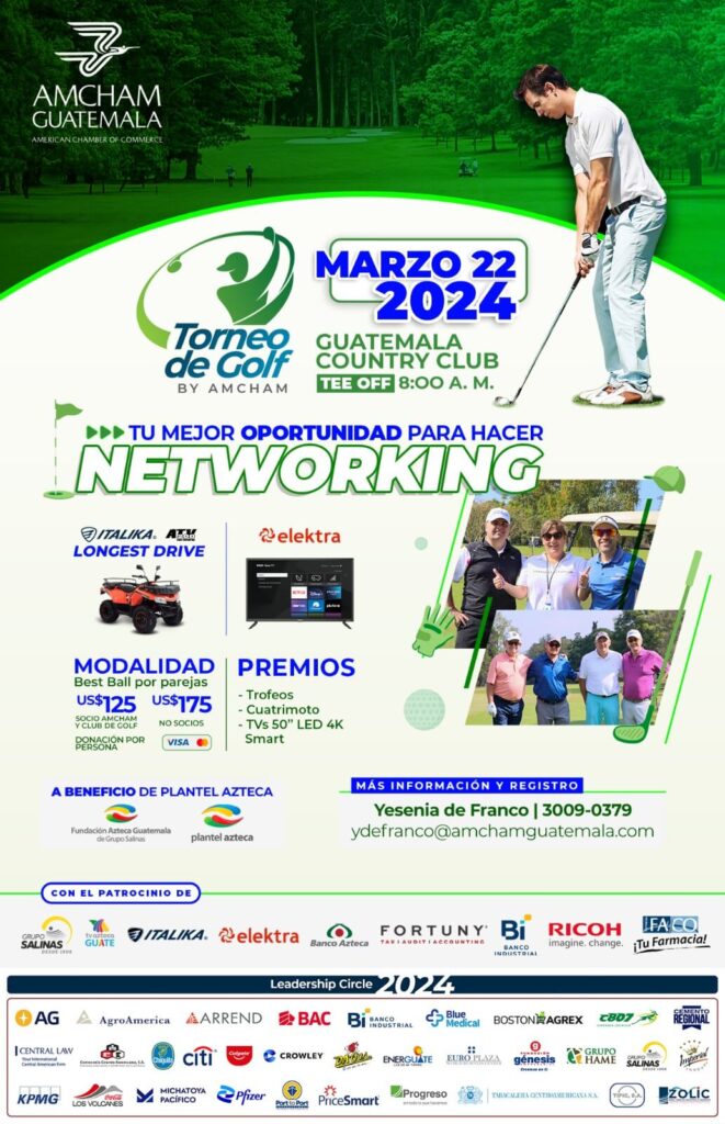 El Torneo de Golf by AmCham se llevará a cabo el próximo 22 de marzo de 2024 en el Guatemala Country Club, localizado en la 30 avenida final de la zona 11, a partir de las 8:00 a. m. La inscripción para jugadores socios de AmCham y del Club es de US$125 y para no socios de US$175.