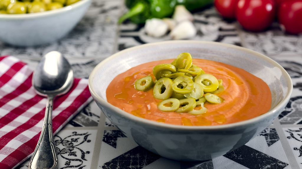 El gazpacho combina lo mejor de la cocina mediterránea en un solo plato. ¿Qué piensa si lo terminamos con unas aceitunas? ¡Aprenda cómo prepararlo con nuestra receta!