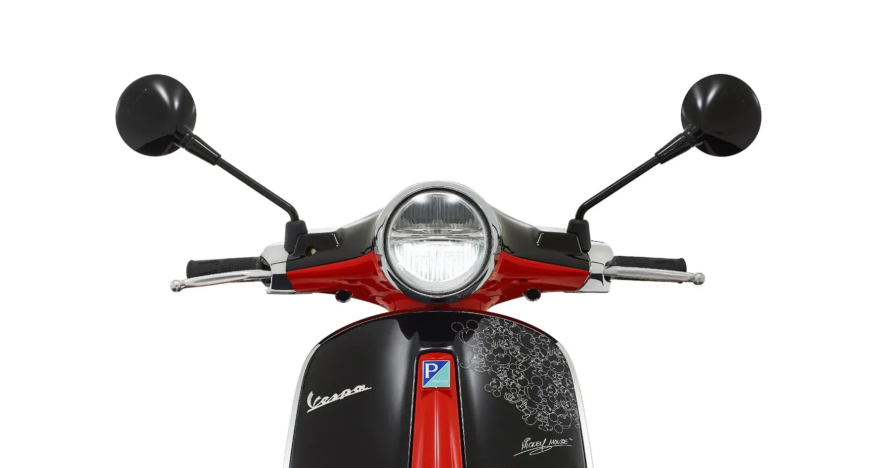 El scooter especial puede escogerse en versiones de 50, 125 y 150 cm3, con grafismos especiales en los que se emplean los colores tradicionales de la piel y el atuendo del ratón más famoso del mundo. De hecho, los retrovisores redondos ya eran conocidos antes de esta colaboración como las “orejas de Mickey”.