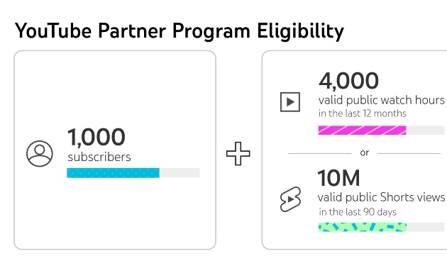 - Obtener 1,000 suscriptores con 10 millones de vistas públicas válidas en video corto (Shorts) en los últimos 90 días.